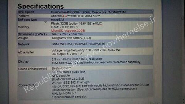 Nowhereelse.fr editor Steve Hemmerstoffertweeted an image containing the specifications of HTC's highly anticipated phablet, providing details which fall in line with previous reports. HTC is expected to unveil the device on Oct. 15 at an event in Asia.